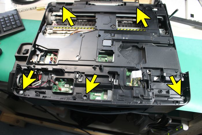 (1)左右のカバーを他を取り外す ツメの場所(□の溝場所)には精密ドライバーなどを使う 左側カバーを外し(まだ支柱にひかかり取れない状態) 支柱を外す(外装部分を左側に広げながら抜く) 右側カバーを外す前にUSBやLANのコードを外す。 ![]() (4)正面左側奥の溝に隠れている十字の部品を取り外す ![]() (6)スキャナユニットを外す 右奥のスキャナユニット開閉軸の部品を確保しておく (スキャナー軸から落ちている可能性がある。) ![]() |