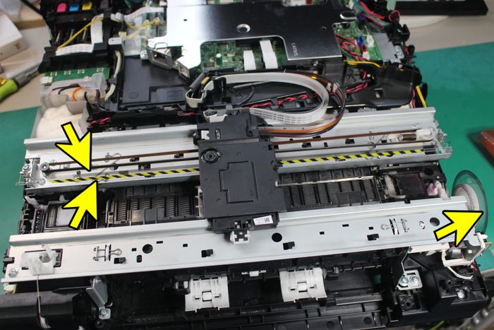 (1)ヘッドユニットのカバー外し ツメがあるところには▲マークが付いている。 ![]() (4)基板をヘッドユニットから外す (5)インクコネクタを外す(上方向へ抜く) 黒いパッキンがコネクタとヘッドの間にある。 流用するので組立時忘れないこと。 (6)プリントヘッド駆動ベルトを外す (6-1)駆動ベルトはバネによりテンションがかかるようになっているのでそれを緩めて外す (7)プリントヘッドを外す (7-1)プリントヘッドが外せる様に溝4箇所が筐体に有るので、そこへヘッドを合わす (7-2)外側の白いガイド枠をプリントヘッドから外す 指で両側を挟んで、黒いホルダーから分離させる 白いガイドローラーは正面方向へスライドさせればプリントヘッドホルダーから外れる プリントヘッドホルダーの端を上に持ち上げると外れる ![]() |