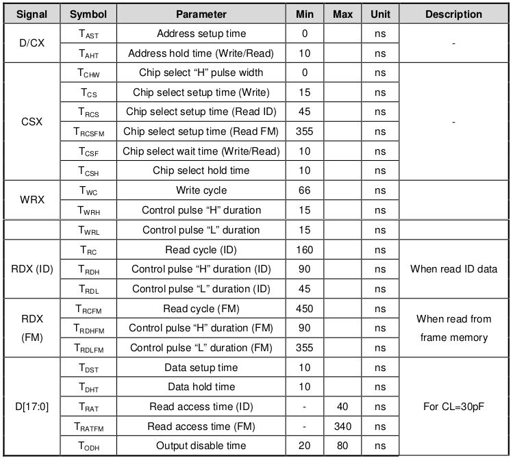 | Read display Interface Pixel Format | 0x0C | R | 2 | Dummy | ||||||||