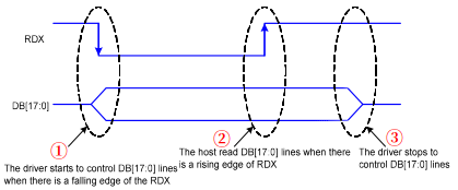 ①ディスプレイ(信号を送る側)は、RDX信号が「立ち下がる(ONからOFFになる)」瞬間に、データ(D lines)を準備して流し始めます。