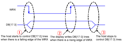 ①ホスト(信号を送る側)は、WDX信号が「立ち下がる(ONからOFFになる)」瞬間に、データ(D lines)を準備して流し始めます。②ディスプレイ(受け取る側)は、WRX信号が「立ち上がる(OFFからONに戻る)」瞬間に、そのデータを読み取ります。