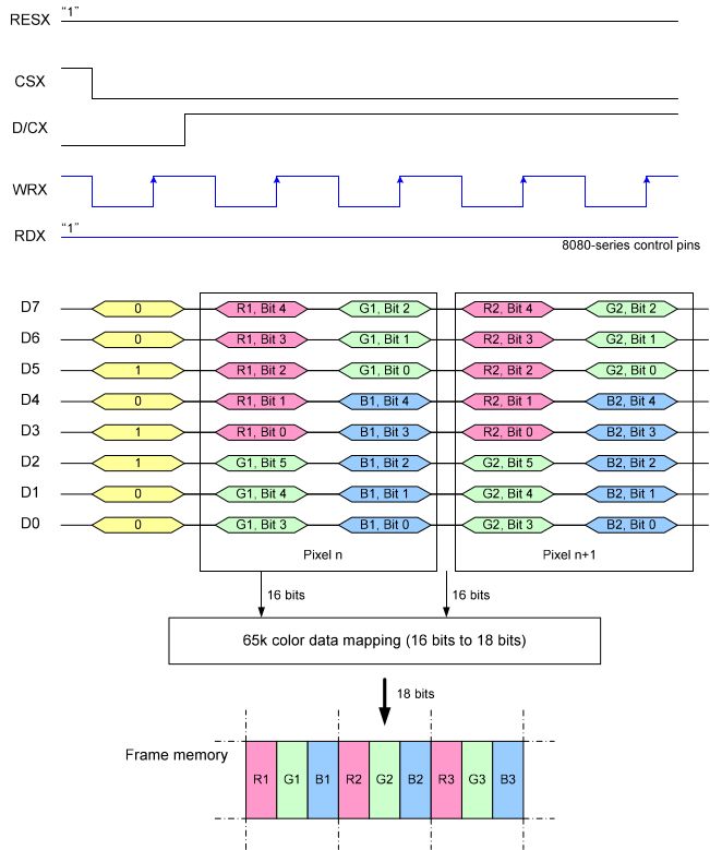 今回はデータBusが8bitで、カラーが65Kなのでピクセルデータは下記の様になる。